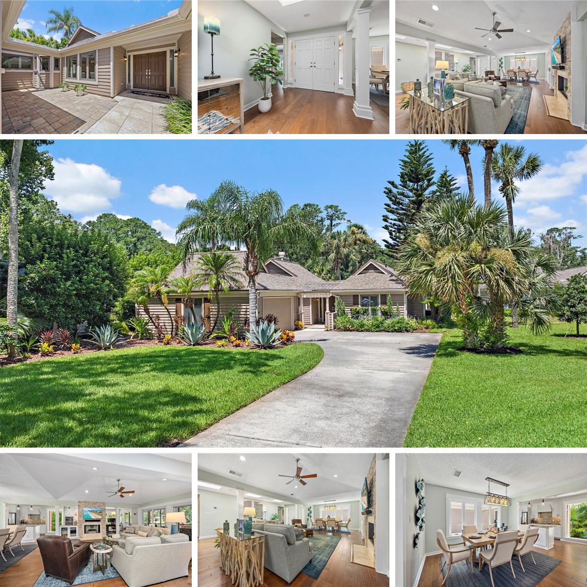 Rare offering in sought-after Lakeside, a quaint neighborhood of just 27 residences, steps to the TPC clubhouse and the renowned Players Championship golf tournament. This beautifully remodeled home is situated on a spectacular lot with 95 feet of water frontage and enjoys breathtaking views and total privacy from neighbors. Past the charming paver courtyard, double doors reveal a light, bright open floor plan and a sea of wood flooring that flows seamlessly throughout the home. The vaulted great room features a stacked stone fireplace, wall mounted 65” Samsung smart TV and sound bar, and 3 sets of Andersen sliding doors with integral blinds, opening to a colossal 650 square-foot covered lanai with stone-look tile and tongue-and-groove wood ceiling, all screened for year-round entertainment. This convivial outdoor living area has plenty of room for dining, ample seating and space for a ping pong or billiard table. The kitchen features white soft-close shaker cabinetry with glass tile backsplash, granite countertops, lighted display cabinets, stainless steel appliances, custom range hood and a wall of pantry cabinets to keep you organized. The adjacent study area is filled with windows to enjoy the water views and accompanying bird life. The king-sized owner’s suite was greatly expanded and has a soaring vaulted ceiling, custom blackout draperies, a California Closet and a spa bath with 2 separate vanities and a 5 x 7 shower with rain and hand-held showerheads, totally open with no glass to clean! Two additional bedrooms are in a separate wing and share a jack-and-jill bath. In addition, there is a stunning powder bath with marble counters, topped with a clear vessel sink, glass tile mirror surround, exquisite designer wallpaper and pendant lights. Every turn reveals designer touches in this move-in ready dream home. Additional noteworthy features: brand new AC ductwork and in-line, central whole house dehumidifying system; new heat pump AC system 2023; new exterior paint, trim & lanai ceiling; roof replaced 2016; new Andersen windows except owner’s suite; hybrid water heater 2018; 2-car garage with copious storage cabinets and professionally landscaped front and back with landscape lighting. Owner will consider selling fully furnished and totally turn-key! This is truly the best location in Players Club. Walk to the TPC Clubhouse for happy hour or dinner, or to Sawgrass Village where numerous shopping and dining options await. You won’t be disappointed!