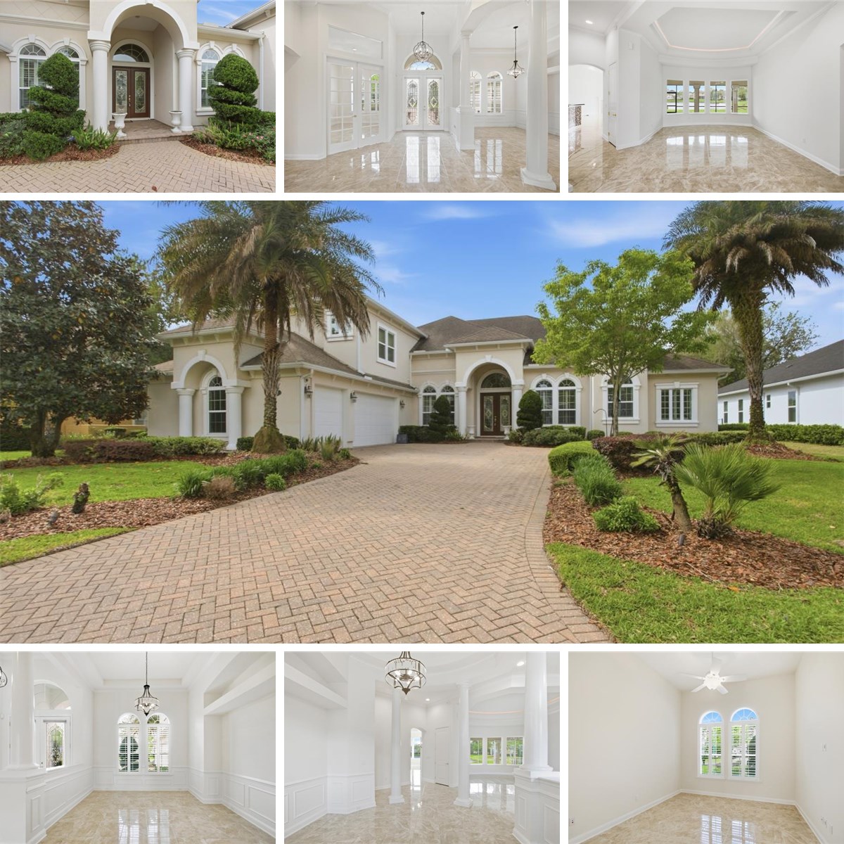 Nestled within the exclusive Julington Creek Estates, this stunning residence boasts an estate lot with breathtaking lake views. Spanning over 4,100 square feet, the home features an open floor plan that allows for lake vistas from the foyer, living room, family room, kitchen, and owner's suite. The first floor includes a formal dining room, an office, and two additional bedrooms, while the upper level offers a spacious bedroom or bonus room with an adjoining bathroom. Bathed in natural light from its picturesque windows and highlighted by a grand two-story ceiling, this remarkable home showcases custom finishes, elegant moldings, and a beautifully designed kitchen and bathrooms. Additional highlights include a large screened lanai and a three-car garage. The Julington Creek Plantation community is a master-planned development rich in amenities, featuring an aquatic complex with family pools, a competitive lane pool, a kiddie splash zone, a fitness center, a café, a recreation center with basketball and tennis courts, baseball and soccer fields, a skate park, and an 18-hole golf course.