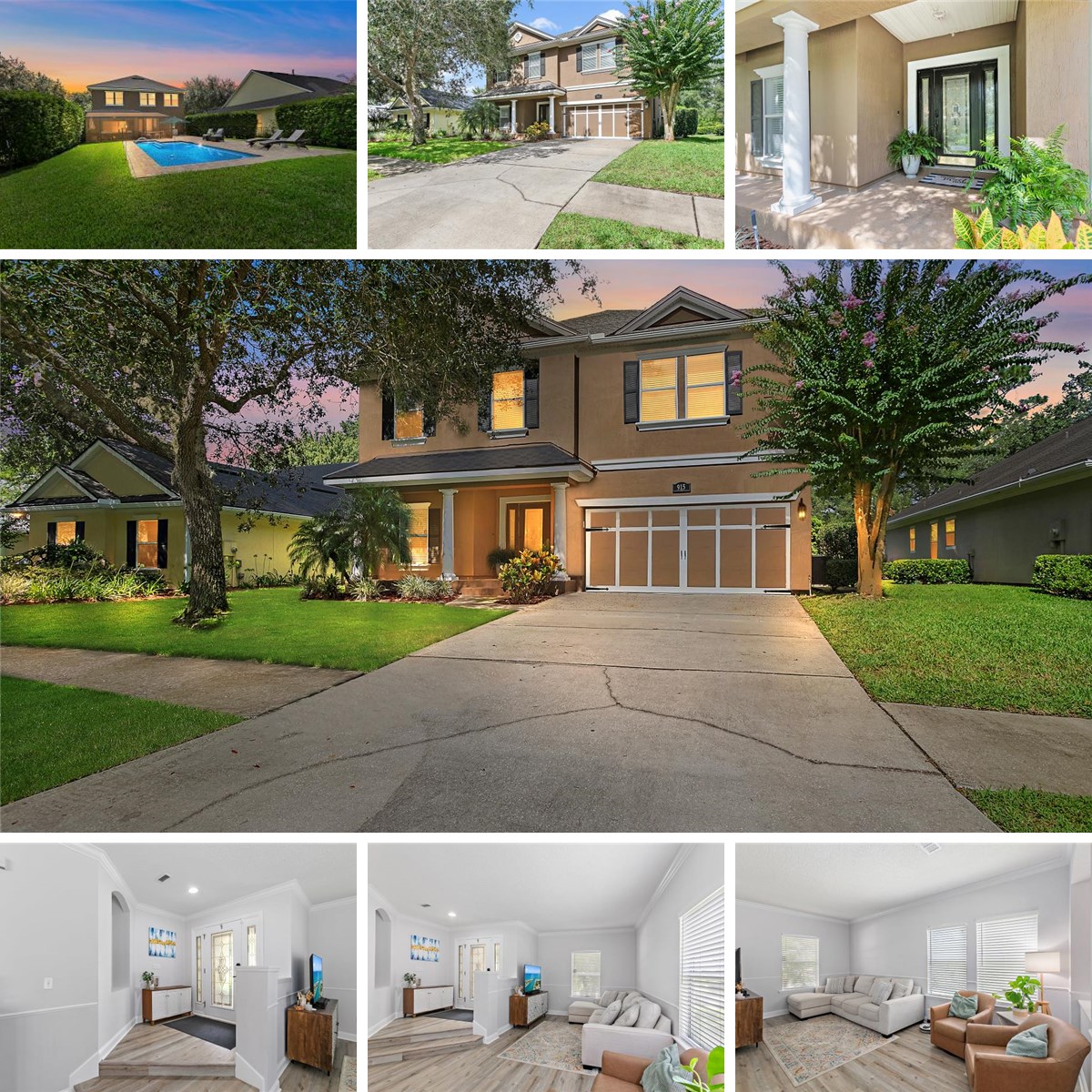 Outdoors is where you'll truly live in this gorgeous pool home, perfectly set on an oversized golf course lot in St Johns Golf & Country Club. Enjoy resort-style living every day with a sparkling saltwater pool. Grill and relax in the screened lanai, or enjoy the beautifully landscaped yard shaded by mature trees. Step inside the open concept layout including LVP flooring throughout the spacious living and dining areas that seamlessly connects to the gourmet kitchen featuring granite counters, 42'' cabinets, stainless appliances, gas range, pantry closet, breakfast bar, and spacious family room—making it effortless to gather with friends and family. The upstairs oversized primary suite includes a large sitting area, beautiful trey ceiling, two walk-in closets, plus a spa-like bath with garden tub, dual vanities and large shower. Three additional bedrooms and a newly remodeled second bath with walk-in shower and double vanity provide space and comfort for everyone. Upstairs laundry room with laundry sink and storage offers convenience to all family members. Major system updates: Roof 2019, pool 2021, A/C downstairs 2023 (electric), A/C upstairs 2021 (gas). Newer interior paint and carpet and garage storage racks 2023. Community perks include championship golf, clubhouse with indoor/outdoor dining, resort pool with splash pad, tennis, full gym, basketball courts, sports fields, and more. Walk to the amenities or stay at home and enjoy your own personal oasis!